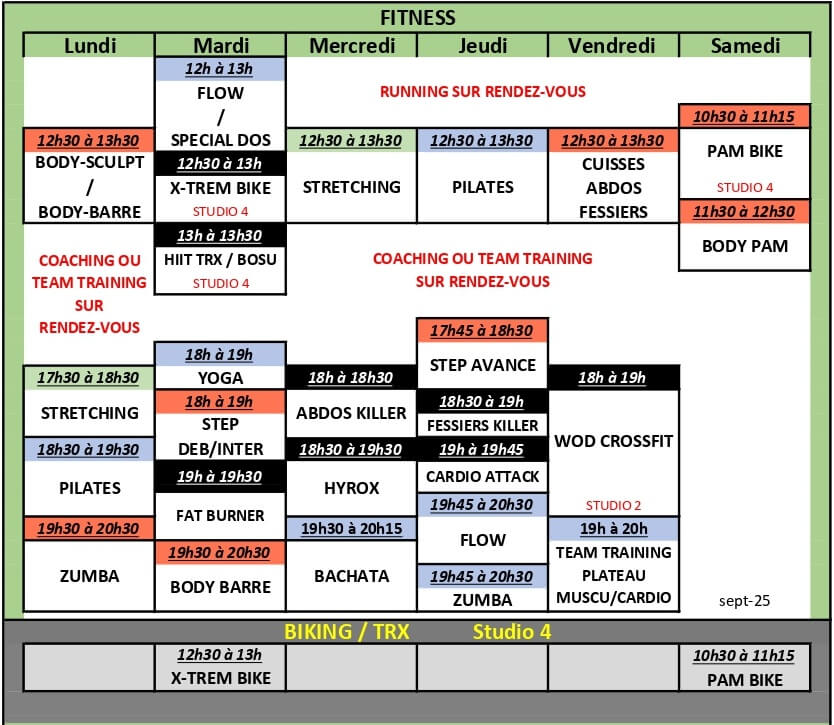 Planning des Cours Collectifs Fitness de Grasse. PAM Loisirs Fitness, c’est près de 40 h de cours collectifs par semaine !